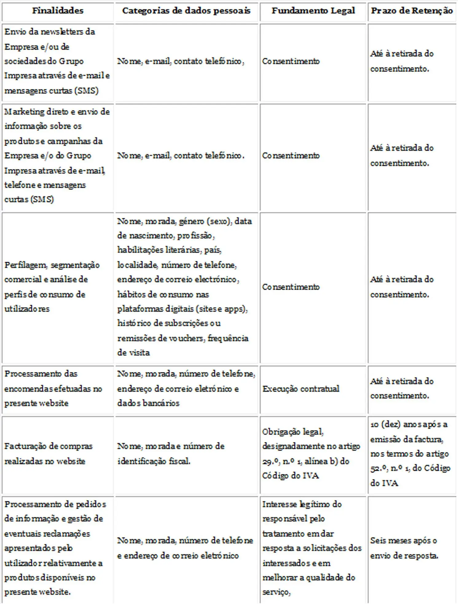 Para podermos prestar-lhe os nossos serviços ou enviar-lhe as nossas comunicações, necessitamos de tratar os seus dados pessoais. Para facilidade de compreensão do fundamento e das condições do tratamento dos seus dados pessoais, optámos por enunciar a informação necessária na tabela que se segue: